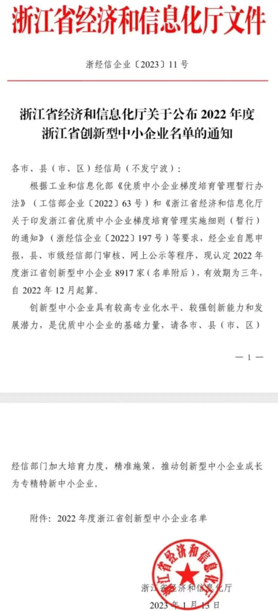 近日,浙江省經濟和信息化廳公布了“2022年度浙江省創新型中小企業”名單,經過公開申報、經濟和信息化主管部門初審推薦、專家評審、網上公示等極為嚴格的評審標準等程序。