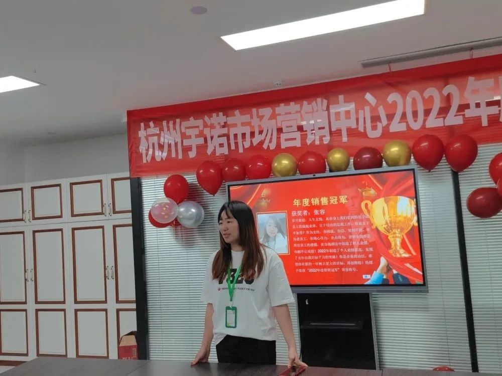 年度銷售冠軍張容上臺發言,從一名新員工到如今的年度銷售冠軍,她表示能取得如此的成績,正是因為宇諾科技提供了她發展的舞臺,她為能進入宇諾遇到韓董事長這個伯樂而倍感榮幸。